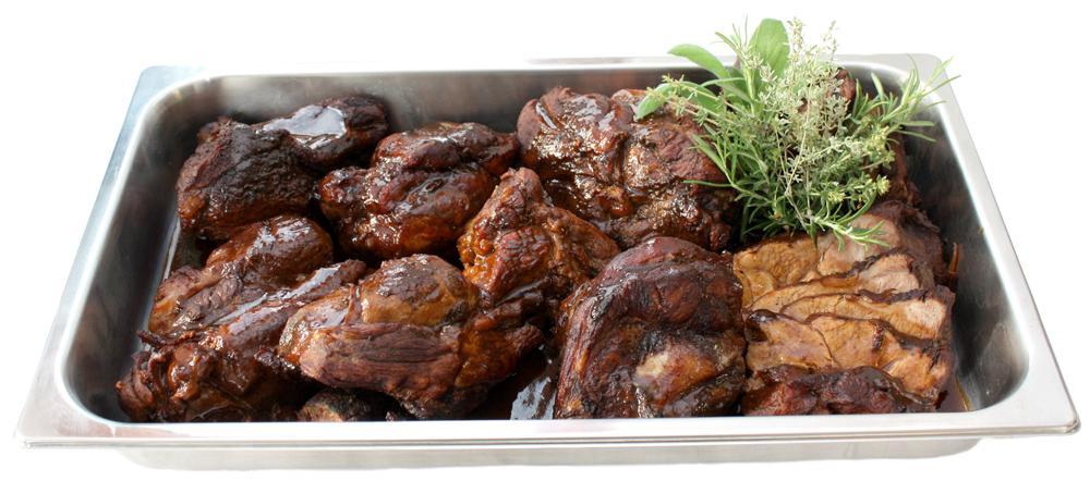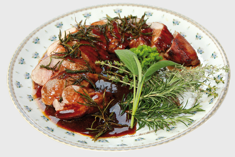 - Geschmorte Schweineschulter in Rotwein-Balsamicojus mit frischem Rosmarin verfeinert